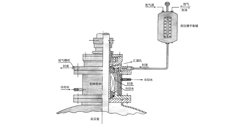 (2)該裝置多在負(fù)壓情況下配用,也可用在正壓工況,負(fù)壓時(shí)高位槽可不用通氣源,正壓時(shí)高位槽接通氣源,調(diào)整好壓力使高位糟及密封腔壓力與釜內(nèi)壓力處于相等或高于釜內(nèi)工作壓力0.05-0.1MPa為佳。